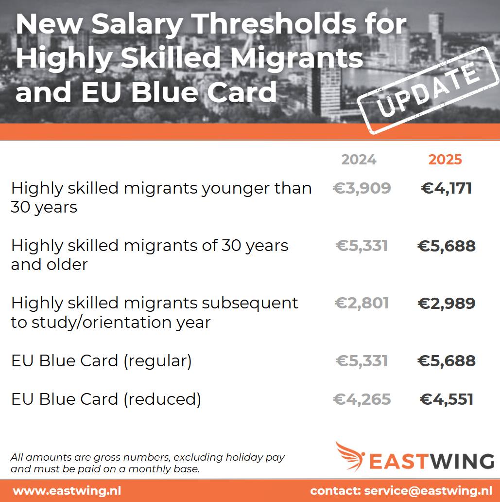 De Immigratie- en Naturalisatiedienst (IND) heeft de nieuwe salarisvereisten voor kennismigranten en EU blauwe kaarthouders voor het jaar 2025 gepubliceerd. Niet-EU arbeidsmigranten die in Nederland een verblijfsvergunning willen aanvragen, moeten voldoen aan de minimumsalariseis die jaarlijks wordt geïndexeerd.